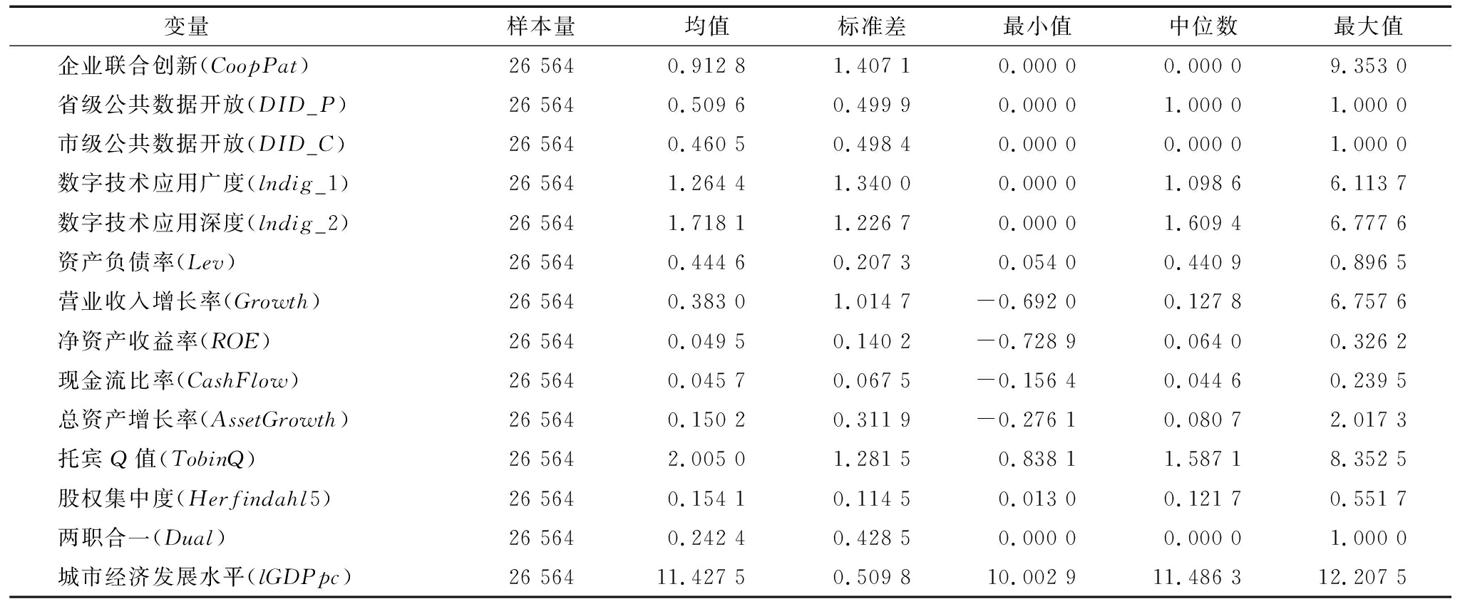 变量 样本量均值标准差最小值中位数最大值企业联合创新(CoopPat)26 5640.912 81.407 10.000 00.000 09.353 0省级公共数据开放(DID_P)26 5640.509 60.499 90.000 01.000 01.000 0市级公共数据开放(DID_C)26 5640.460 50.498 40.000 00.000 01.000 0数字技术应用广度(lndig_1)26 5641.264 41.340 00.000 01.098 66.113 7数字技术应用深度(lndig_2)26 5641.718 11.226 70.000 01.609 46.777 6资产负债率(Lev)26 5640.444 60.207 30.054 00.440 90.896 5营业收入增长率(Growth)26 5640.383 01.014 7-0.692 00.127 86.757 6净资产收益率(ROE)26 5640.049 50.140 2-0.728 90.064 00.326 2现金流比率(CashFlow)26 5640.045 70.067 5-0.156 40.044 60.239 5总资产增长率(AssetGrowth)26 5640.150 20.311 9-0.276 10.080 72.017 3托宾Q值(TobinQ)26 5642.005 01.281 50.838 11.587 18.352 5股权集中度(Herfindahl5)26 5640.154 10.114 50.013 00.121 70.551 7两职合一(Dual)26 5640.242 40.428 50.000 00.000 01.000 0城市经济发展水平(lGDPpc)26 56411.427 50.509 810.002 911.486 312.207 5