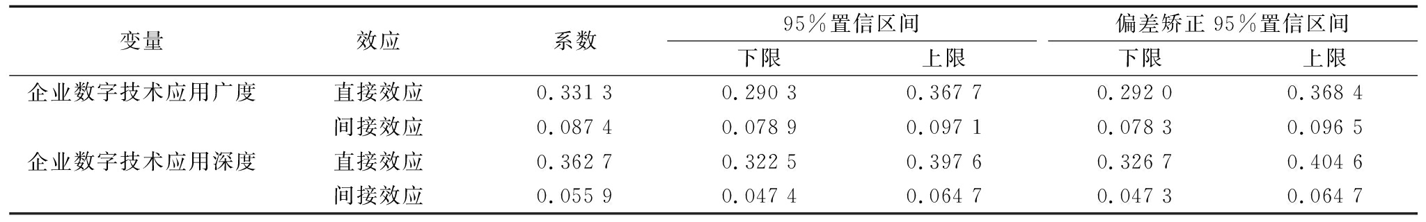 变量效应系数95%置信区间下限上限偏差矫正95%置信区间下限上限企业数字技术应用广度直接效应0.331 30.290 30.367 70.292 00.368 4间接效应0.087 40.078 90.097 10.078 30.096 5企业数字技术应用深度直接效应0.362 70.322 50.397 60.326 70.404 6间接效应0.055 90.047 40.064 70.047 30.064 7