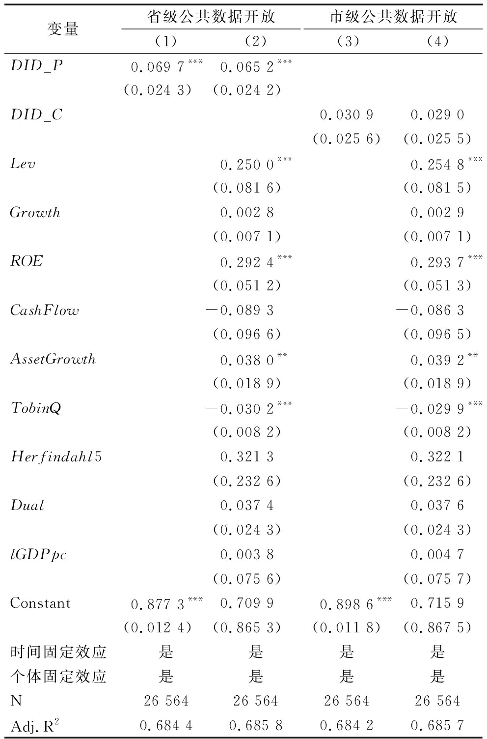 变量省级公共数据开放(1)(2)市级公共数据开放(3)(4)DID_P0.069 7***0.065 2***(0.024 3)(0.024 2)DID_C0.030 90.029 0(0.025 6)(0.025 5)Lev0.250 0***0.254 8***(0.081 6)(0.081 5)Growth0.002 80.002 9(0.007 1)(0.007 1)ROE0.292 4***0.293 7***(0.051 2)(0.051 3)CashFlow-0.089 3-0.086 3(0.096 6)(0.096 5)AssetGrowth0.038 0**0.039 2**(0.018 9)(0.018 9)TobinQ-0.030 2***-0.029 9***(0.008 2)(0.008 2)Herfindahl50.321 30.322 1(0.232 6)(0.232 6)Dual0.037 40.037 6(0.024 3)(0.024 3)lGDPpc0.003 80.004 7(0.075 6)(0.075 7)Constant0.877 3***0.709 90.898 6***0.715 9(0.012 4)(0.865 3)(0.011 8)(0.867 5)时间固定效应是是是是个体固定效应是是是是N26 56426 56426 56426 564Adj.R20.684 40.685 80.684 20.685 7