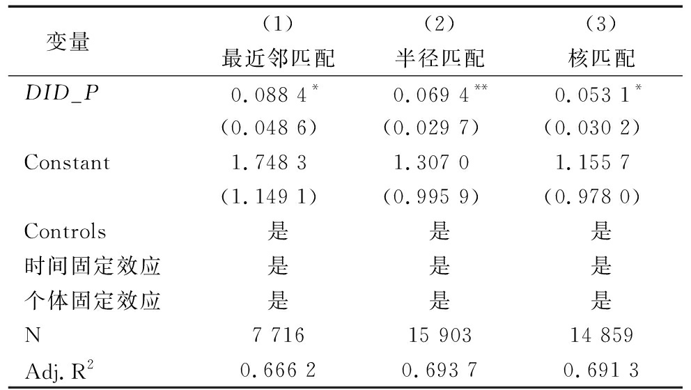 变量 (1)(2)(3)最近邻匹配半径匹配核匹配DID_P0.088 4*0.069 4**0.053 1*(0.048 6)(0.029 7)(0.030 2)Constant1.748 31.307 01.155 7(1.149 1)(0.995 9)(0.978 0)Controls是是是时间固定效应是是是个体固定效应是是是N7 71615 90314 859Adj.R20.666 20.693 70.691 3