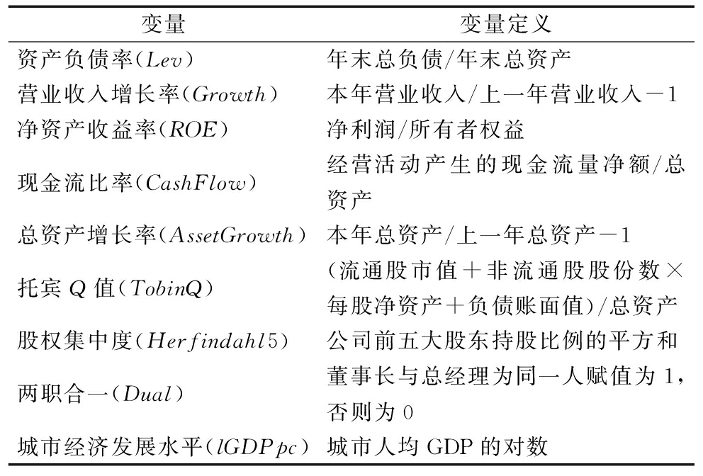 (4)控制变量。借鉴已有研究[2,17,22],本文选取如下控制变量:①资产负债率(Lev);②营业收入增长率(Growth);③净资产收益率(ROE);④现金流比率(CashFlow);⑤总资产增长率(AssetGrowth);⑥托宾Q值(TobinQ);⑦股权集中度(Herfindahl5);⑧两职合一(Dual);⑨城市经济发展水平(lGDPpc)。具体定义见表1。