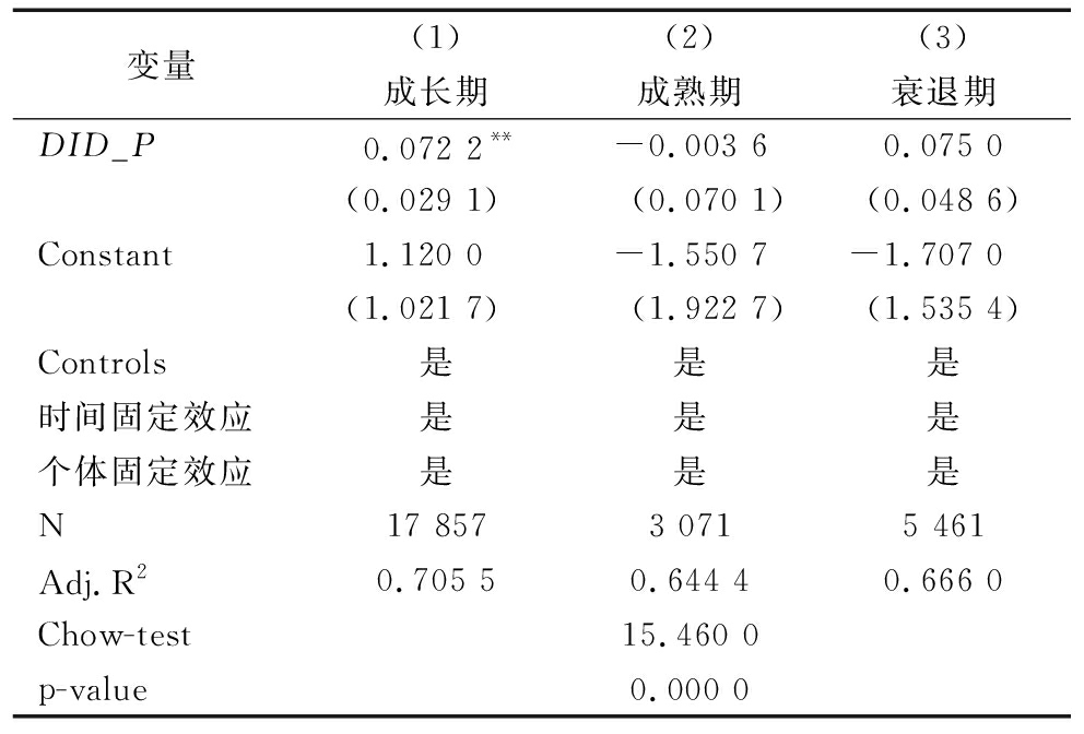 变量(1)(2)(3)成长期成熟期衰退期DID_P0.072 2**-0.003 60.075 0(0.029 1)(0.070 1)(0.048 6)Constant1.120 0-1.550 7-1.707 0(1.021 7)(1.922 7)(1.535 4)Controls是是是时间固定效应是是是个体固定效应是是是N17 8573 0715 461Adj.R20.705 50.644 40.666 0Chow-test15.460 0p-value0.000 0