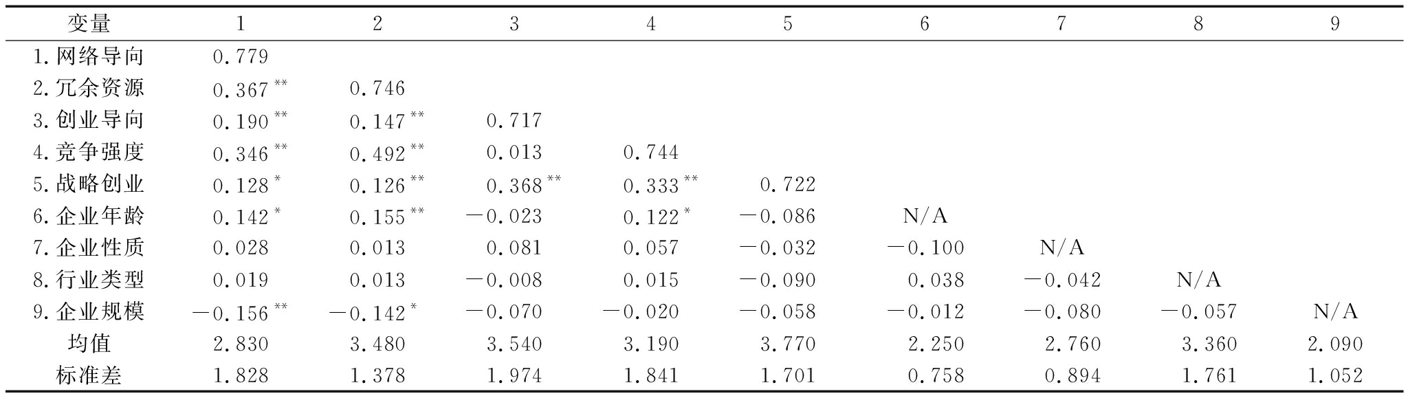 变量1234567891.网络导向0.7792.冗余资源0.367**0.7463.创业导向0.190**0.147**0.7174.竞争强度0.346**0.492**0.0130.7445.战略创业0.128*0.126**0.368**0.333**0.7226.企业年龄0.142*0.155**-0.0230.122*-0.086N/A7.企业性质0.0280.0130.0810.057-0.032-0.100N/A8.行业类型0.0190.013-0.0080.015-0.0900.038-0.042N/A9.企业规模-0.156**-0.142*-0.070-0.020-0.058-0.012-0.080-0.057N/A均值2.8303.4803.5403.1903.7702.2502.7603.3602.090标准差1.8281.3781.9741.8411.7010.7580.8941.7611.052