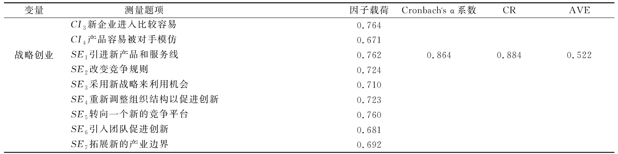 变量测量题项因子载荷Cronbach's α系数CRAVECI3 新企业进入比较容易0.764CI4 产品容易被对手模仿0.671战略创业SE1 引进新产品和服务线0.7620.8640.8840.522SE2 改变竞争规则0.724SE3 采用新战略来利用机会0.710SE4 重新调整组织结构以促进创新0.723SE5 转向一个新的竞争平台0.760SE6 引入团队促进创新0.681SE7 拓展新的产业边界0.692
