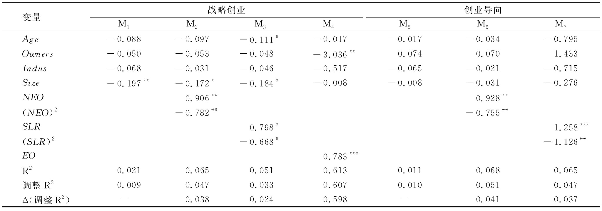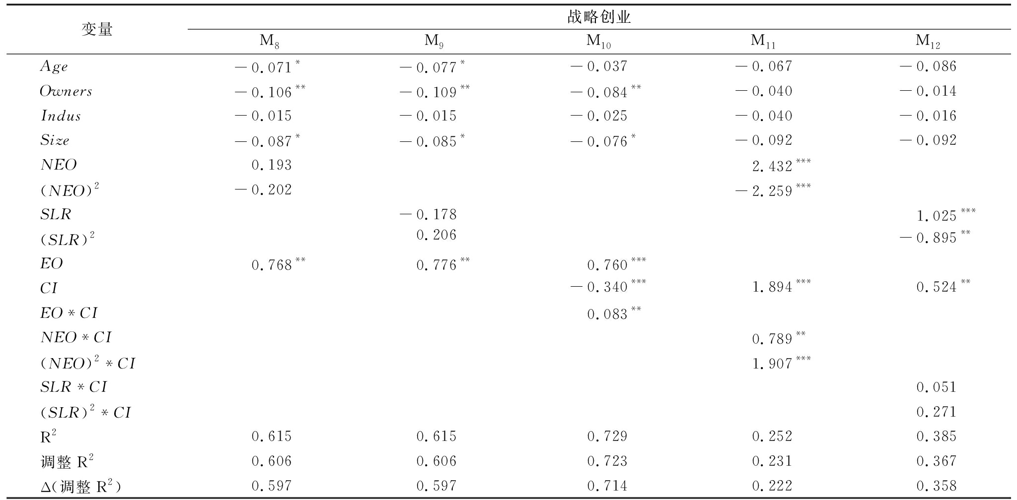 变量战略创业M8M9M10M11M12Age-0.071*-0.077*-0.037-0.067-0.086Owners-0.106**-0.109**-0.084**-0.040-0.014Indus-0.015-0.015-0.025-0.040-0.016Size-0.087*-0.085*-0.076*-0.092-0.092NEO0.1932.432***(NEO)2-0.202-2.259***SLR-0.1781.025***(SLR)20.206-0.895**EO0.768**0.776**0.760***CI-0.340***1.894***0.524**EO*CI0.083**NEO*CI0.789**(NEO)2*CI 1.907***SLR*CI0.051(SLR)2*CI0.271R20.6150.6150.7290.2520.385调整R20.6060.6060.7230.2310.367Δ(调整R2)0.5970.5970.7140.2220.358