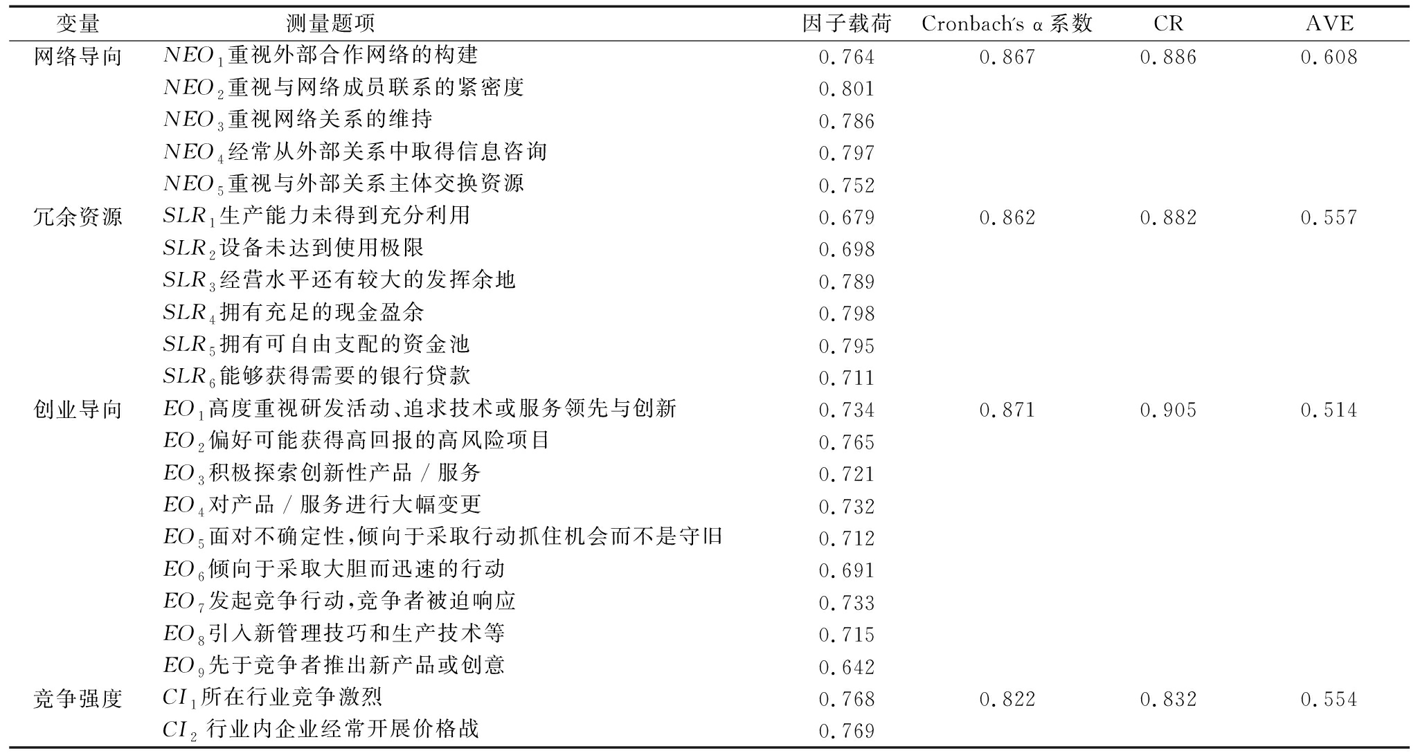 变量测量题项因子载荷Cronbach's α系数CRAVE网络导向NEO1 重视外部合作网络的构建0.7640.8670.8860.608NEO2 重视与网络成员联系的紧密度0.801NEO3 重视网络关系的维持0.786NEO4 经常从外部关系中取得信息咨询0.797NEO5 重视与外部关系主体交换资源0.752冗余资源SLR1 生产能力未得到充分利用0.6790.8620.8820.557SLR2 设备未达到使用极限0.698SLR3 经营水平还有较大的发挥余地0.789SLR4 拥有充足的现金盈余0.798SLR5 拥有可自由支配的资金池0.795SLR6 能够获得需要的银行贷款0.711创业导向EO1 高度重视研发活动、追求技术或服务领先与创新0.7340.8710.9050.514EO2 偏好可能获得高回报的高风险项目0.765EO3 积极探索创新性产品/服务0.721EO4 对产品/服务进行大幅变更0.732EO5 面对不确定性,倾向于采取行动抓住机会而不是守旧0.712EO6 倾向于采取大胆而迅速的行动0.691EO7 发起竞争行动,竞争者被迫响应0.733EO8 引入新管理技巧和生产技术等0.715EO9 先于竞争者推出新产品或创意0.642竞争强度CI1 所在行业竞争激烈0.7680.8220.8320.554CI2行业内企业经常开展价格战0.769