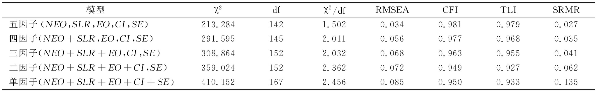 模型χ2dfχ2/dfRMSEACFITLISRMR五因子(NEO,SLR,EO,CI,SE)213.2841421.5020.0340.9810.9790.027四因子(NEO+SLR,EO,CI,SE)291.5951452.0110.0560.9770.9680.035三因子(NEO+SLR+EO,CI,SE)308.8641522.0320.0680.9630.9550.041二因子(NEO+SLR+EO+CI,SE)359.0241522.3620.0720.9490.9270.062单因子(NEO+SLR+EO+CI+SE)410.1521672.4560.0850.9500.9330.135