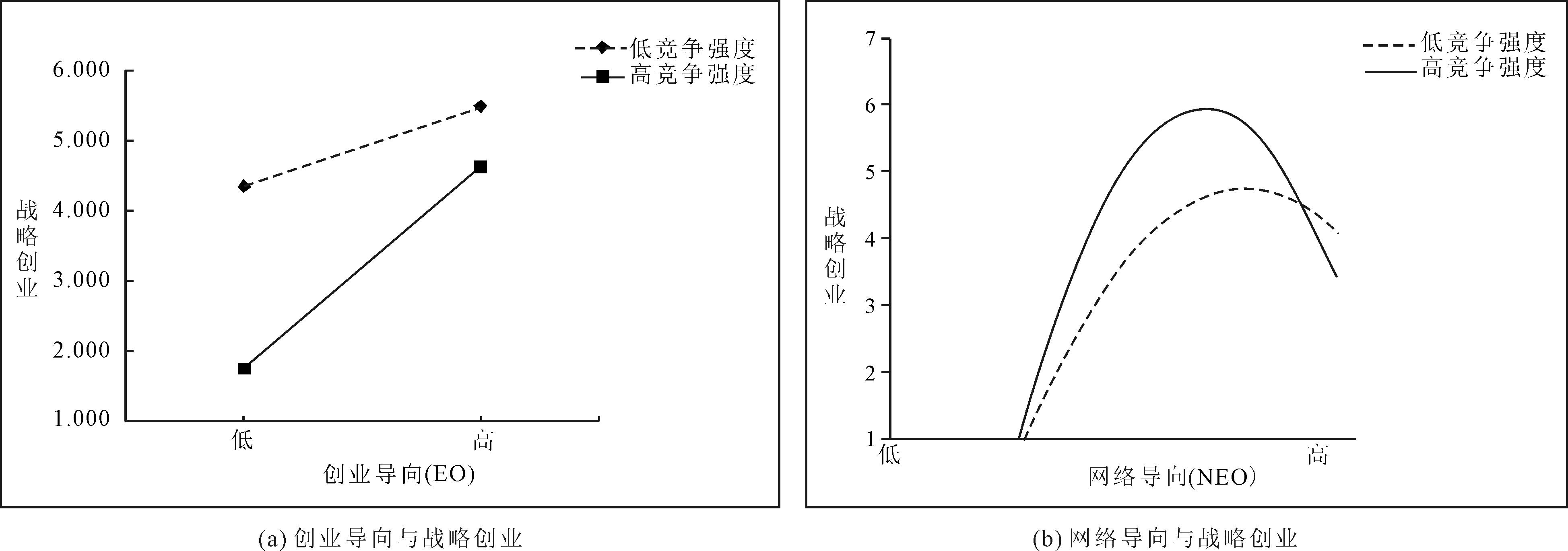 在高竞争强度下,通过网络导向获取的外部资源和知识有助于企业快速适应市场变化[37]。同时,这有助于促进企业创新和提升企业战略灵活性,从而使得网络导向对战略创业的正向影响更加显著。高竞争强度促使企业更加重视通过外部网络分担风险和降低不确定性,从而更有效地开展战略创业活动。由此,竞争强度使网络导向对战略创业的正向效应得到进一步强化。然而,过度依赖外部网络可能会使企业忽视内部创新能力培育,同时导致企业资源过度分散[38]。高度市场竞争会进一步加大企业应对外部挑战的难度,从而使网络导向对战略创业的负向影响更加显著。