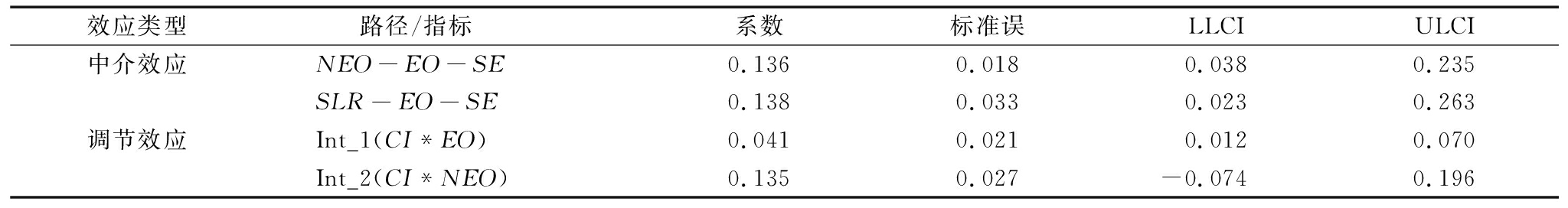 效应类型路径/指标 系数标准误LLCIULCI中介效应NEO-EO-SE0.1360.0180.0380.235SLR-EO-SE0.1380.0330.0230.263调节效应Int_1(CI*EO)0.0410.0210.0120.070Int_2(CI*NEO)0.1350.027-0.0740.196