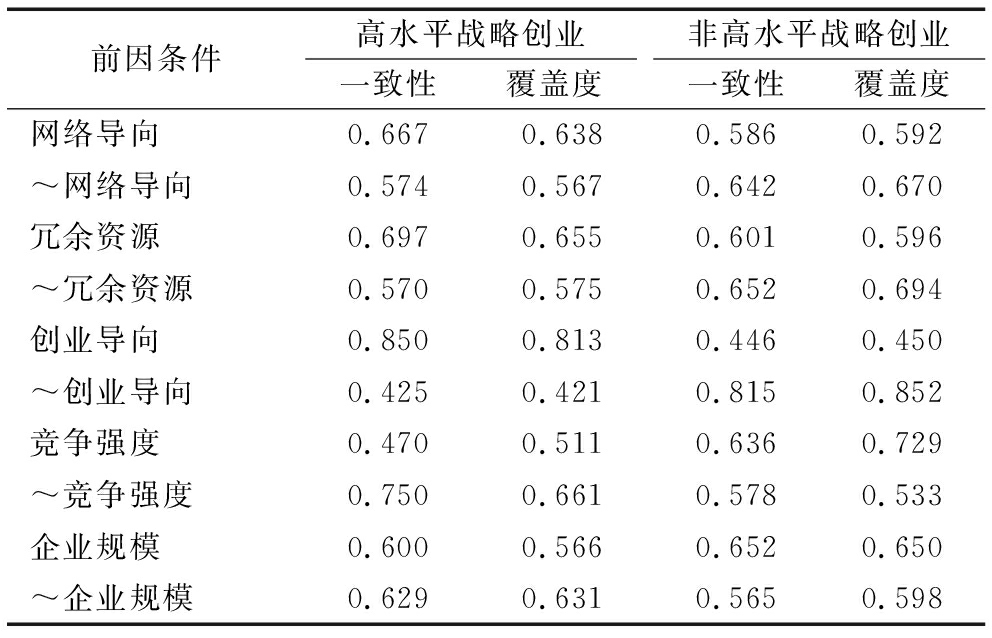 本研究选取网络导向、冗余资源、创业导向、竞争强度和企业规模作为战略创业前因条件,原因如下:一是考虑到前4个变量对战略创业的影响已在理论和实证分析中得到验证;二是作为控制变量的企业规模与战略创业存在显著相关性,其它统计学变量则在多数情况下均不显著。