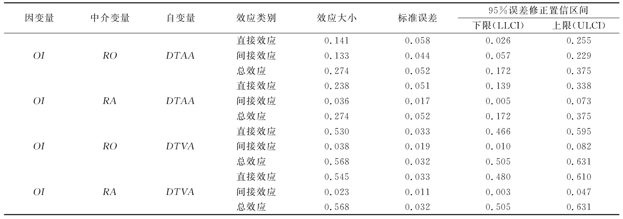 因变量中介变量自变量效应类别效应大小标准误差95%误差修正置信区间下限(LLCI)上限(ULCI) 直接效应0.1410.0580.0260.255OIRODTAA间接效应0.1330.0440.0570.229 总效应 0.2740.0520.1720.375 直接效应0.2380.0510.1390.338OIRADTAA间接效应0.0360.0170.0050.073 总效应 0.2740.0520.1720.375 直接效应0.5300.0330.4660.595OIRODTVA间接效应0.0380.0190.0100.082 总效应 0.5680.0320.5050.631 直接效应0.5450.0330.4800.610OIRADTVA间接效应0.0230.0110.0030.047 总效应 0.5680.0320.5050.631