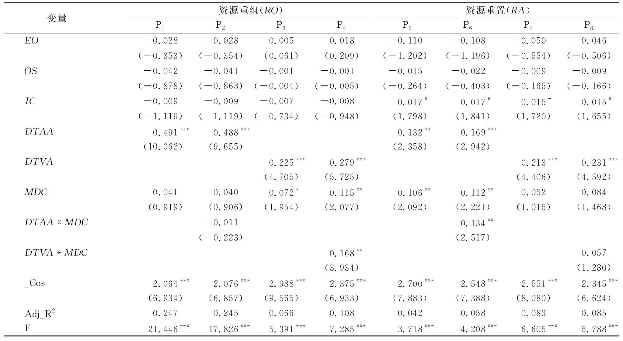 变量 资源重组(RO)P1P2P3P4资源重置(RA)P5P6P7P8EO-0.028-0.0280.0050.018-0.110-0.108-0.050-0.046(-0.353)(-0.354)(0.061)(0.209)(-1.202)(-1.196)(-0.554)(-0.506)OS-0.042-0.041-0.001-0.001-0.015-0.022-0.009-0.009(-0.878)(-0.863)(-0.004)(-0.005)(-0.264)(-0.403)(-0.165)(-0.166)IC-0.009-0.009-0.007-0.0080.017*0.017*0.015*0.015*(-1.119)(-1.119)(-0.734)(-0.948)(1.798)(1.841)(1.720)(1.655)DTAA0.491***0.488***0.132**0.169***(10.062)(9.655)(2.358)(2.942)DTVA0.225***0.279***0.213***0.231***(4.705)(5.725)(4.406)(4.592)MDC0.0410.0400.072*0.115**0.106**0.112**0.0520.084(0.919)(0.906)(1.954)(2.077)(2.092)(2.221)(1.015)(1.468)DTAA*MDC-0.0110.134**(-0.223)(2.517)DTVA*MDC0.168**0.057(3.934)(1.280)_Cos2.064***2.076***2.988***2.375***2.700***2.548***2.551***2.345***(6.934)(6.857)(9.565)(6.933)(7.883)(7.388)(8.080)(6.624)Adj_R20.2470.2450.0660.1080.0420.0580.0830.085F21.446***17.826***5.391***7.285***3.718***4.208***6.605***5.788***