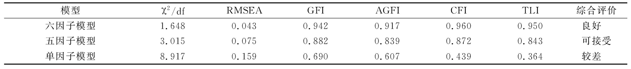 模型χ2/dfRMSEAGFIAGFICFITLI综合评价六因子模型1.6480.0430.9420.9170.9600.950良好 五因子模型3.0150.0750.8820.8390.8720.843可接受单因子模型8.9170.1590.6900.6070.4390.364较差