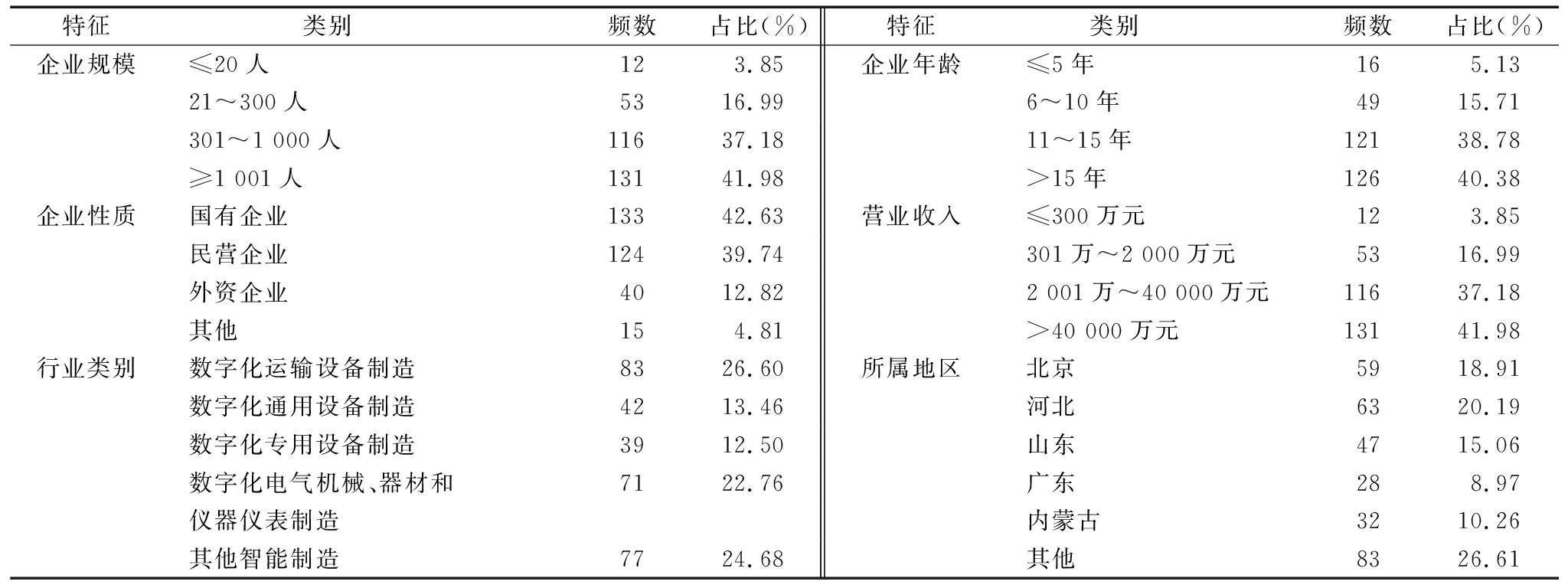 特征类别 频数占比(%)特征类别 频数占比(%)企业规模≤20人123.85企业年龄≤5年165.1321~300人5316.996~10年4915.71301~1 000人11637.1811~15年12138.78≥1 001人13141.98>15年12640.38企业性质国有企业13342.63营业收入≤300万元123.85民营企业12439.74301万~2 000万元5316.99外资企业4012.822 001万~40 000万元11637.18其他154.81>40 000万元13141.98行业类别数字化运输设备制造8326.60所属地区北京5918.91数字化通用设备制造4213.46河北6320.19数字化专用设备制造3912.50山东4715.06数字化电气机械、器材和7122.76广东288.97仪器仪表制造内蒙古3210.26其他智能制造7724.68其他8326.61