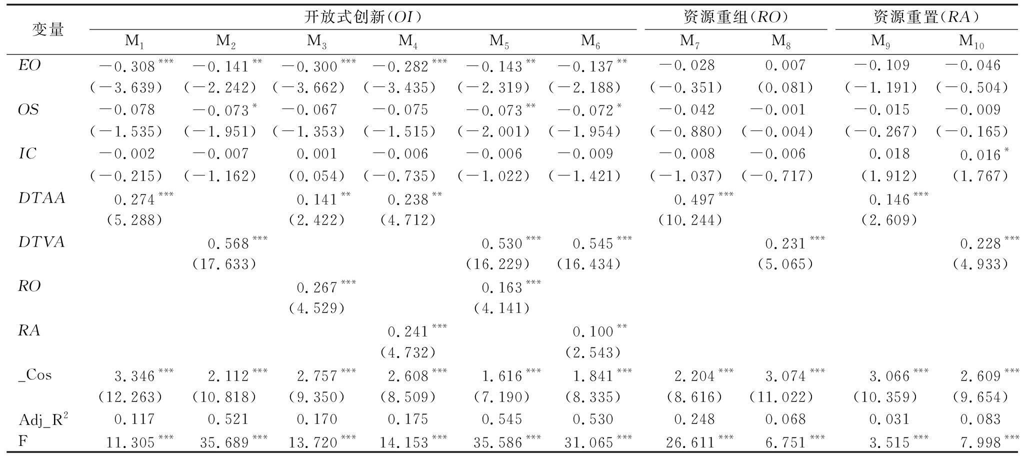 变量开放式创新(OI)M1M2M3M4M5M6资源重组(RO)M7M8资源重置(RA)M9M10EO-0.308***-0.141**-0.300***-0.282***-0.143**-0.137**-0.0280.007-0.109-0.046(-3.639)(-2.242)(-3.662)(-3.435)(-2.319)(-2.188)(-0.351)(0.081)(-1.191)(-0.504)OS-0.078-0.073*-0.067-0.075-0.073**-0.072*-0.042-0.001-0.015-0.009(-1.535)(-1.951)(-1.353)(-1.515)(-2.001)(-1.954)(-0.880)(-0.004)(-0.267)(-0.165)IC-0.002-0.0070.001-0.006-0.006-0.009-0.008-0.0060.0180.016*(-0.215)(-1.162)(0.054)(-0.735)(-1.022)(-1.421)(-1.037)(-0.717)(1.912)(1.767)DTAA0.274***0.141**0.238**0.497***0.146***(5.288)(2.422)(4.712)(10.244)(2.609)DTVA0.568***0.530***0.545***0.231***0.228***(17.633)(16.229)(16.434)(5.065)(4.933)RO0.267***0.163***(4.529)(4.141)RA0.241***0.100**(4.732)(2.543)_Cos3.346***2.112***2.757***2.608***1.616***1.841***2.204***3.074***3.066***2.609***(12.263)(10.818)(9.350)(8.509)(7.190)(8.335)(8.616)(11.022)(10.359)(9.654)Adj_R20.1170.5210.1700.1750.5450.5300.2480.0680.0310.083F11.305***35.689***13.720***14.153***35.586***31.065***26.611***6.751***3.515***7.998***