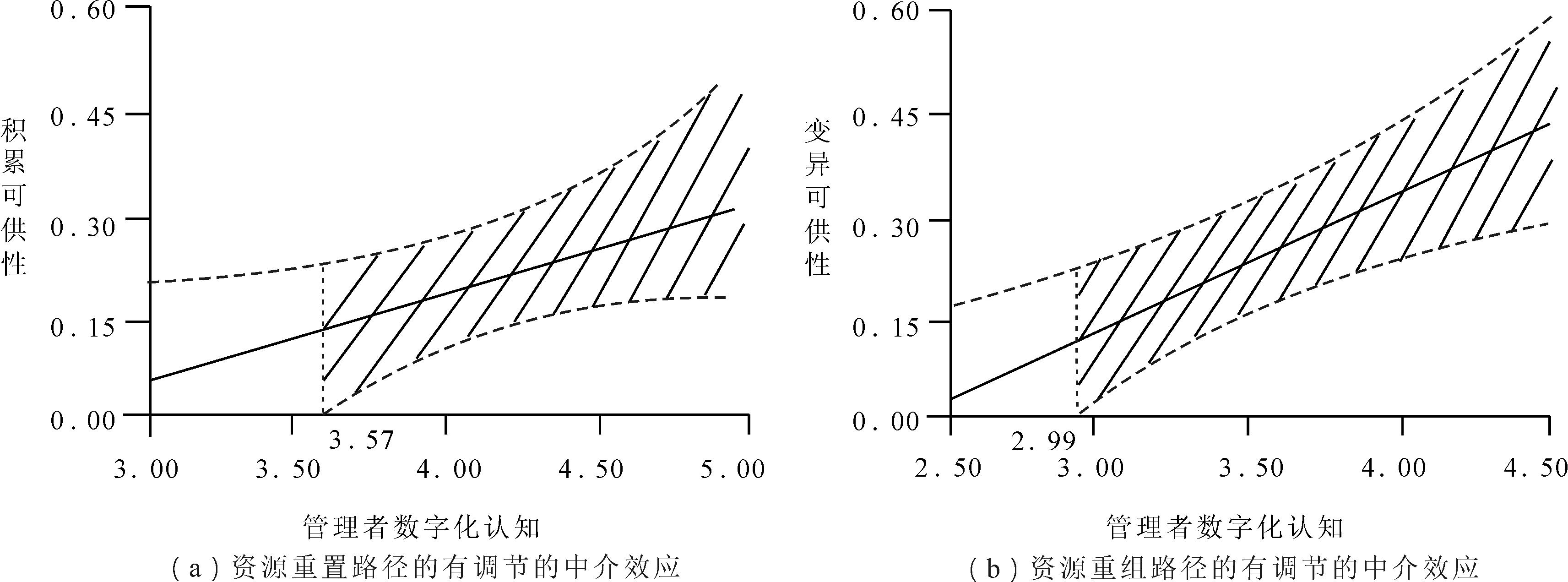 绘制资源重组和资源重置路径有调节的中介效应图(见图2),可知当管理者数字化认知大于3.57时(5分为满分),积累可供性通过资源重置对开放式创新的影响是显著的;当管理者数字化认知大于2.99时(5分为满分),变异可供性通过资源重组对开放式创新的影响是显著的。