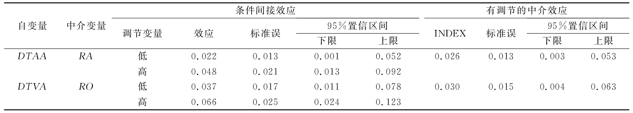 自变量中介变量条件间接效应调节变量效应标准误95%置信区间下限上限有调节的中介效应INDEX标准误95%置信区间下限上限DTAARA低0.0220.0130.0010.0520.0260.0130.0030.053高0.0480.0210.0130.092DTVARO低0.0370.0170.0110.0780.0300.0150.0040.063高0.0660.0250.0240.123