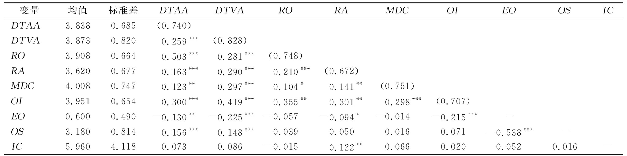 变量均值标准差DTAADTVARORAMDCOIEOOSICDTAA3.8380.685(0.740)DTVA3.8730.8200.259***(0.828)RO3.9080.6640.503***0.281***(0.748)RA3.6200.6770.163***0.290***0.210***(0.672)MDC 4.0080.7470.123**0.297***0.104*0.141**(0.751)OI3.9510.6540.300***0.419***0.355**0.301**0.298***(0.707)EO0.6000.490-0.130**-0.225***-0.057-0.094*-0.014-0.215***-OS3.1800.8140.156***0.148***0.0390.0500.0160.071-0.538***-IC5.9604.1180.0730.086-0.0150.122**0.0660.0200.0520.016-