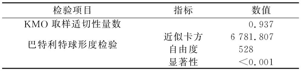 检验项目指标数值KMO 取样适切性量数0.937巴特利特球形度检验近似卡方6 781.807自由度528显著性<0.001