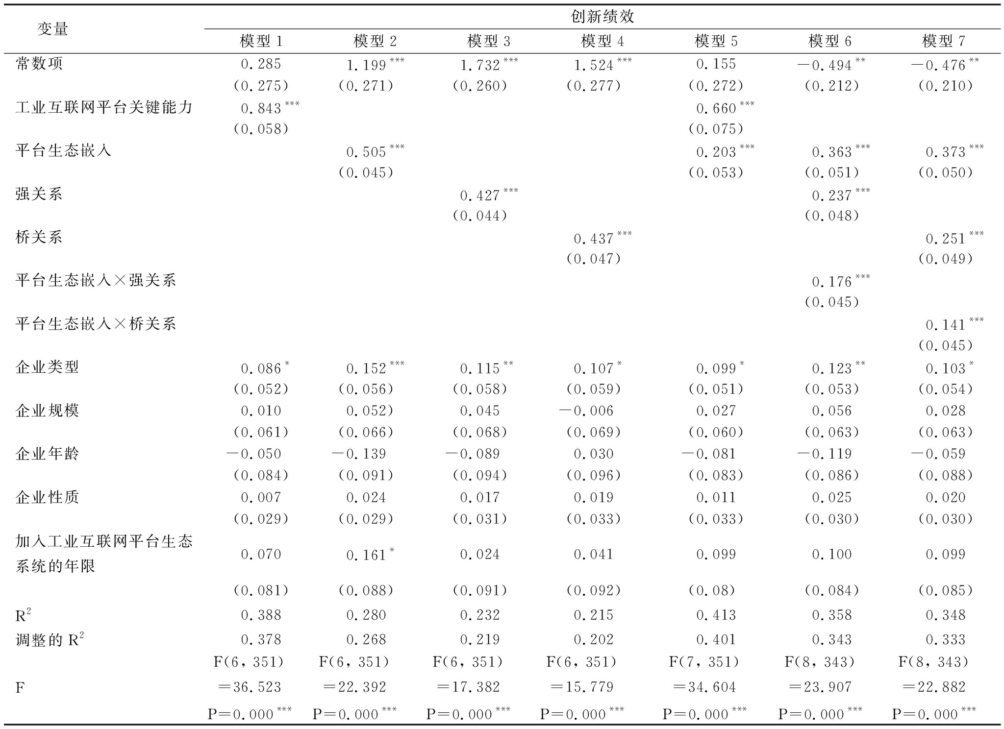 变量创新绩效模型1模型2模型3模型4模型5模型6模型7常数项0.2851.199***1.732***1.524***0.155-0.494**-0.476**(0.275)(0.271)(0.260)(0.277)(0.272)(0.212)(0.210)工业互联网平台关键能力0.843***0.660***(0.058)(0.075)平台生态嵌入0.505***0.203***0.363***0.373***(0.045)(0.053)(0.051)(0.050)强关系0.427***0.237***(0.044)(0.048)桥关系0.437***0.251***(0.047)(0.049)平台生态嵌入×强关系0.176***(0.045)平台生态嵌入×桥关系0.141***(0.045)企业类型0.086*0.152***0.115**0.107*0.099*0.123**0.103*(0.052)(0.056)(0.058)(0.059)(0.051)(0.053)(0.054)企业规模0.0100.052)0.045-0.0060.0270.0560.028(0.061)(0.066)(0.068)(0.069)(0.060)(0.063)(0.063)企业年龄-0.050-0.139-0.0890.030-0.081-0.119-0.059(0.084)(0.091)(0.094)(0.096)(0.083)(0.086)(0.088)企业性质0.0070.0240.0170.0190.0110.0250.020(0.029)(0.029)(0.031)(0.033)(0.033)(0.030)(0.030)加入工业互联网平台生态系统的年限0.0700.161*0.0240.0410.0990.1000.099(0.081)(0.088)(0.091)(0.092)(0.08)(0.084)(0.085)R20.3880.2800.2320.2150.4130.3580.348调整的R20.3780.2680.2190.2020.4010.3430.333FF(6, 351) =36.523P=0.000***F(6, 351) =22.392P=0.000***F(6, 351) =17.382P=0.000***F(6, 351)=15.779P=0.000***F(7, 351)=34.604P=0.000***F(8, 343)=23.907P=0.000***F(8, 343)=22.882P=0.000***
