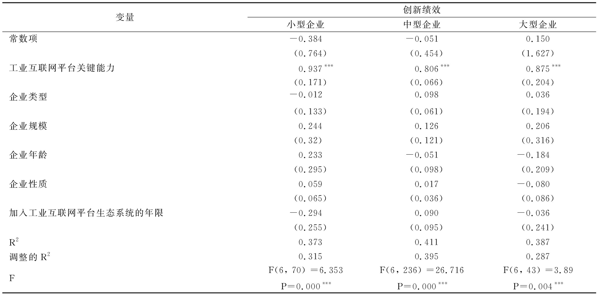 变量创新绩效小型企业中型企业大型企业常数项-0.384-0.0510.150(0.764)(0.454)(1.627)工业互联网平台关键能力0.937***0.806***0.875***(0.171)(0.066)(0.204)企业类型-0.0120.0980.036(0.133)(0.061)(0.194)企业规模0.2440.1260.206(0.32)(0.121)(0.316)企业年龄0.233-0.051-0.184(0.295)(0.098)(0.209)企业性质0.0590.017-0.080(0.065)(0.036)(0.086)加入工业互联网平台生态系统的年限-0.2940.090-0.036(0.255)(0.095)(0.241)R20.3730.4110.387调整的R20.3150.3950.287FF(6, 70) =6.353P=0.000***F(6, 236) =26.716P=0.000***F(6, 43) =3.89P=0.004***