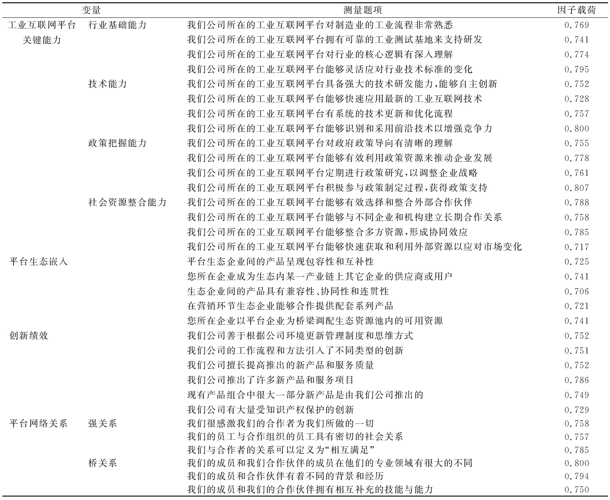 变量测量题项因子载荷工业互联网平台关键能力行业基础能力我们公司所在的工业互联网平台对制造业的工业流程非常熟悉0.769我们公司所在的工业互联网平台拥有可靠的工业测试基地来支持研发0.741我们公司所在的工业互联网平台对行业的核心逻辑有深入理解0.774我们公司所在的工业互联网平台能够灵活应对行业技术标准的变化0.795技术能力我们公司所在的工业互联网平台具备强大的技术研发能力,能够自主创新0.752我们公司所在的工业互联网平台能够快速应用最新的工业互联网技术0.728我们公司所在的工业互联网平台有系统的技术更新和优化流程0.757我们公司所在的工业互联网平台能够识别和采用前沿技术以增强竞争力0.800政策把握能力我们公司所在的工业互联网平台对政府政策导向有清晰的理解0.755我们公司所在的工业互联网平台能够有效利用政策资源来推动企业发展0.778我们公司所在的工业互联网平台定期进行政策研究,以调整企业战略0.761我们公司所在的工业互联网平台积极参与政策制定过程,获得政策支持0.807社会资源整合能力我们公司所在的工业互联网平台能够有效选择和整合外部合作伙伴0.788我们公司所在的工业互联网平台能够与不同企业和机构建立长期合作关系0.758我们公司所在的工业互联网平台能够整合多方资源,形成协同效应0.785我们公司所在的工业互联网平台能够快速获取和利用外部资源以应对市场变化0.717平台生态嵌入平台生态企业间的产品呈现包容性和互补性0.725您所在企业成为生态内某一产业链上其它企业的供应商或用户0.741生态企业间的产品具有兼容性、协同性和连贯性0.706在营销环节生态企业能够合作提供配套系列产品0.721您所在企业以平台企业为桥梁调配生态资源池内的可用资源0.741创新绩效我们公司善于根据公司环境更新管理制度和思维方式0.752我们公司的工作流程和方法引入了不同类型的创新0.751我们公司擅长提高推出的新产品和服务质量0.752我们公司推出了许多新产品和服务项目0.786现有产品组合中很大一部分新产品是由我们公司推出的0.749我们公司有大量受知识产权保护的创新0.729平台网络关系强关系我们很感激我们的合作者为我们所做的一切0.758我们的员工与合作组织的员工具有密切的社会关系0.757我们与合作者的关系可以定义为“相互满足”0.785桥关系我们的成员和我们合作伙伴的成员在他们的专业领域有很大的不同0.800我们的成员和合作伙伴有着不同的背景和经历0.794我们的成员和我们的合作伙伴拥有相互补充的技能与能力0.750