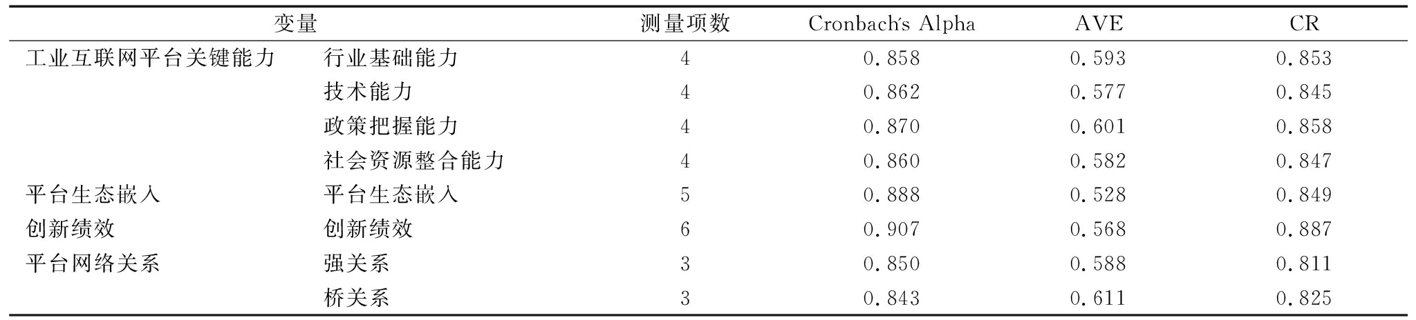 变量测量项数Cronbach's AlphaAVECR工业互联网平台关键能力行业基础能力40.8580.5930.853技术能力40.8620.5770.845政策把握能力40.8700.6010.858社会资源整合能力40.8600.5820.847平台生态嵌入平台生态嵌入50.8880.5280.849创新绩效创新绩效60.9070.5680.887平台网络关系强关系30.8500.5880.811桥关系30.8430.6110.825