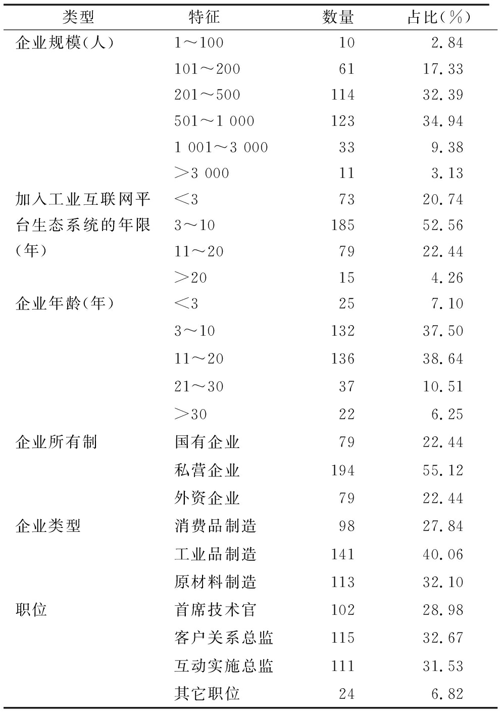 类型特征数量占比(%) 企业规模(人)1~100102.84101~2006117.33201~50011432.39501~1 00012334.941 001~3 000339.38>3 000113.13加入工业互联网平台生态系统的年限(年)<37320.743~1018552.5611~207922.44>20154.26企业年龄(年)<3257.103~1013237.5011~2013638.6421~303710.51>30226.25企业所有制国有企业7922.44私营企业19455.12外资企业7922.44企业类型消费品制造9827.84工业品制造14140.06原材料制造11332.10职位首席技术官10228.98客户关系总监11532.67互动实施总监11131.53其它职位246.82