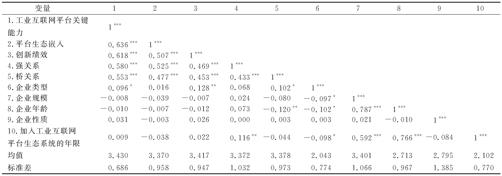 变量123456789101.工业互联网平台关键能力1***2.平台生态嵌入0.636***1***3.创新绩效0.618***0.507***1***4.强关系0.580***0.525***0.469***1***5.桥关系0.553***0.477***0.453***0.433***1***6.企业类型0.096*0.0160.128**0.0680.102*1***7.企业规模-0.008-0.039-0.0070.024-0.080-0.097*1***8.企业年龄-0.010-0.007-0.0120.073-0.120**-0.102*0.787***1***9.企业性质0.031-0.0030.0260.0000.0030.0030.021-0.0101***10.加入工业互联网平台生态系统的年限0.009-0.0380.0220.116**-0.044-0.098*0.592***0.766***-0.0841***均值3.4303.3703.4173.3723.3782.0433.4012.7132.7952.102标准差0.6860.9580.9471.0320.9730.7741.0660.9671.3850.770