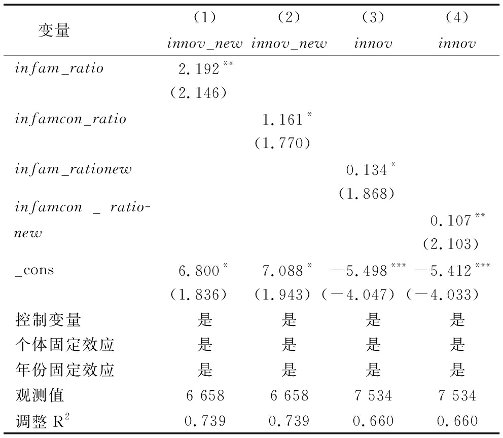 表3汇报了本文的基准回归结果。其中,列(1)(2)未加入控制变量,列(3)(4)加入控制变量。无论是否加入控制变量,解释变量infam_ratio、infamcon_ratio的回归系数均为正,且至少通过10%水平上的显著性检验,说明非家族股东所有权涉入和控制权涉入均显著促进家族企业创新,支持研究假设H1。