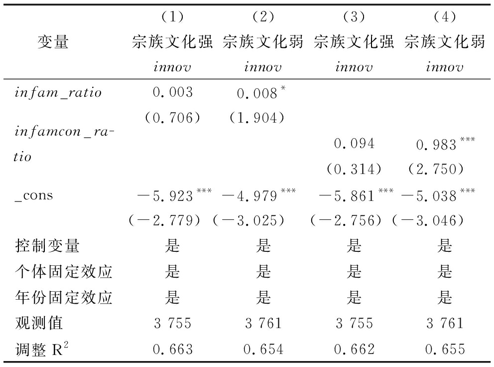 变量(1)宗族文化强(2)宗族文化弱(3)宗族文化强(4)宗族文化弱innovinnovinnovinnovinfam_ratio0.0030.008*(0.706)(1.904)infamcon_ra-tio0.0940.983***(0.314)(2.750)_cons-5.923***-4.979***-5.861***-5.038***(-2.779)(-3.025)(-2.756)(-3.046)控制变量是是是是个体固定效应是是是是年份固定效应是是是是观测值3 7553 7613 7553 761调整R20.6630.6540.6620.655