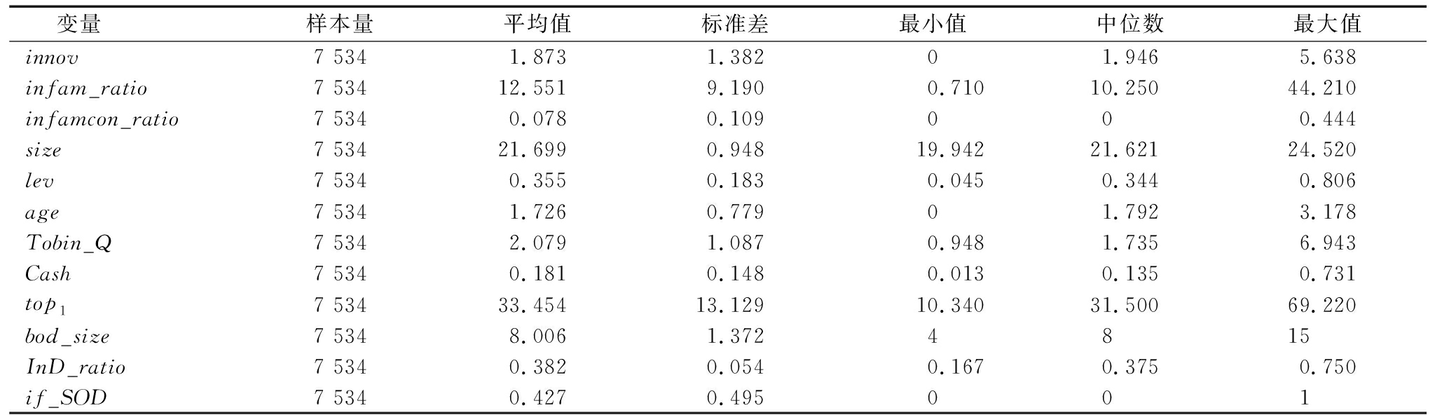 实证分析中,在统计非家族股东所有权涉入和控制权涉入数据前,需要排除家族股东。参考蔡贵龙等(2018)的做法,本文对股东间关联关系进行核实,即如果上市公司年报中股东信息与家族控制人属于“一致行动人”或“控股关系”的情况,则这类股东可能在制定公司决策时与家族控制人选择共同行动,故本文将这类股东视为家族股东并予以剔除。在排除上述家族股东后,在所有权涉入(infam_ratio)方面,采用前十大股东中全部非家族股东持股比例之和衡量。通过搜集整理上市公司年报中披露的前十大股东持股比例和股东信息,得到股东持股数据。在控制权涉入(infamcon_ratio)方面,采用非家族股东委派董事数与董事会总人数的比值衡量。参考蔡贵龙等(2018)的做法,分两种情况:一是若非家族股东为自然人且此人在董事会任职,则视此人委派自身在董事会任职;二是若非家族股东为法人股东,家族企业董事在该股东单位任职则认为该法人股东委派了一名董事。本文通过搜集查阅上市公司年报中公司董事专业背景、主要工作经历以及在股东单位任职情况等,手工整理得到非家族股东委派董事信息。