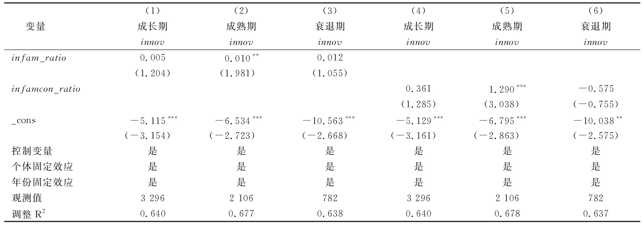 (1)(2)(3)(4)(5)(6)变量成长期成熟期衰退期成长期成熟期衰退期innovinnovinnovinnovinnovinnovinfam_ratio0.0050.010**0.012(1.204)(1.981)(1.055)infamcon_ratio0.3611.290***-0.575(1.285)(3.038)(-0.755)_cons-5.115***-6.534***-10.563***-5.129***-6.795***-10.038**(-3.154)(-2.723)(-2.668)(-3.161)(-2.863)(-2.575)控制变量是是是是是是个体固定效应是是是是是是年份固定效应是是是是是是观测值3 2962 1067823 2962 106782调整R20.6400.6770.6380.6400.6780.637