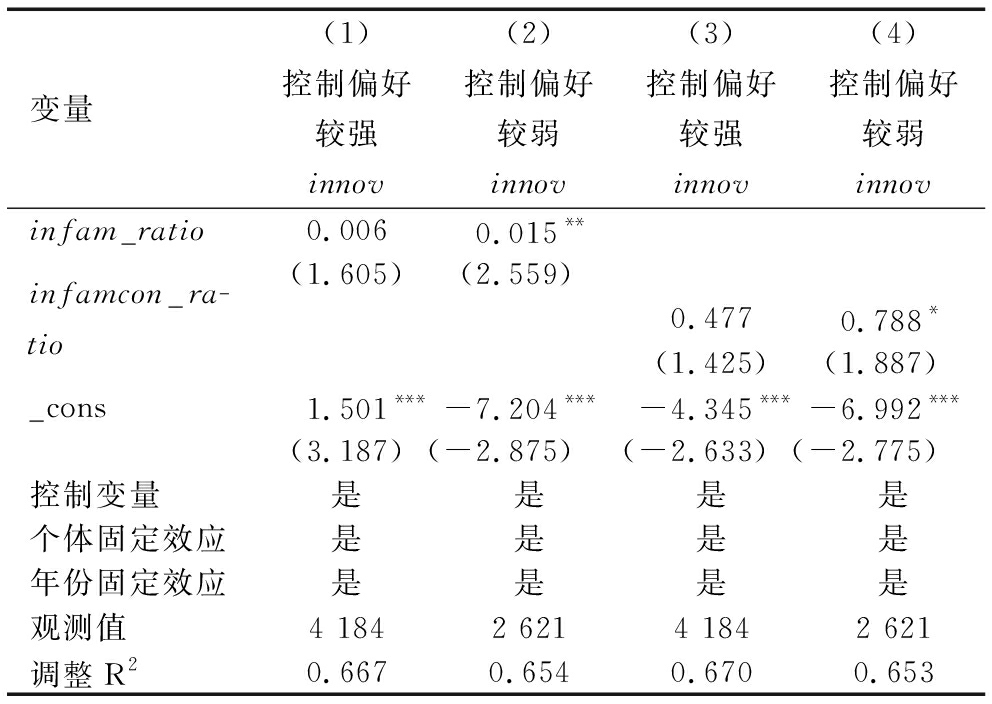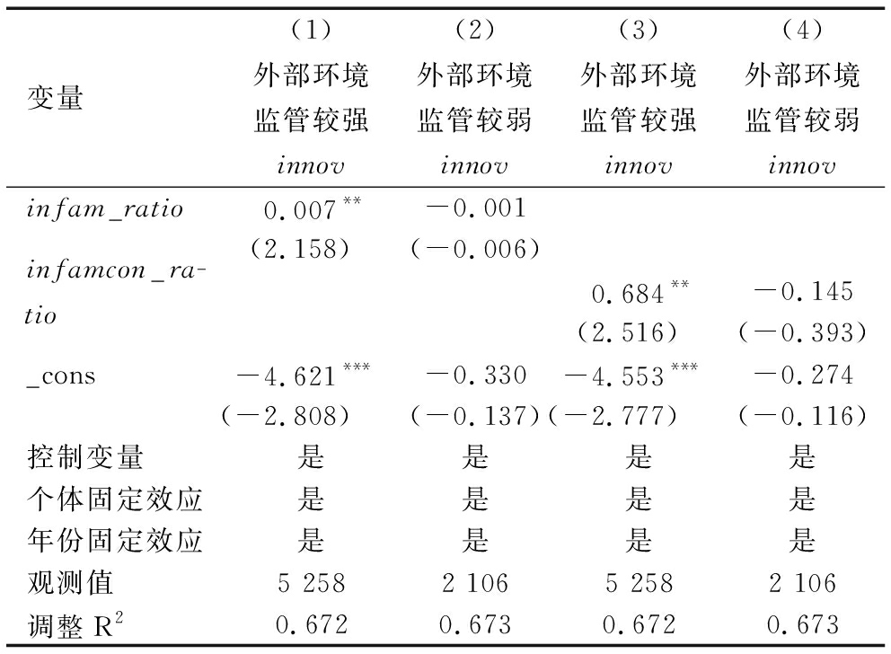变量(1)外部环境监管较强(2)外部环境监管较弱(3)外部环境监管较强(4)外部环境监管较弱innovinnovinnovinnovinfam_ratio0.007**-0.001(2.158)(-0.006)infamcon_ra-tio0.684**-0.145(2.516)(-0.393)_cons-4.621***-0.330-4.553***-0.274(-2.808)(-0.137)(-2.777)(-0.116)控制变量是是是是个体固定效应是是是是年份固定效应是是是是观测值5 2582 1065 2582 106调整R20.6720.6730.6720.673
