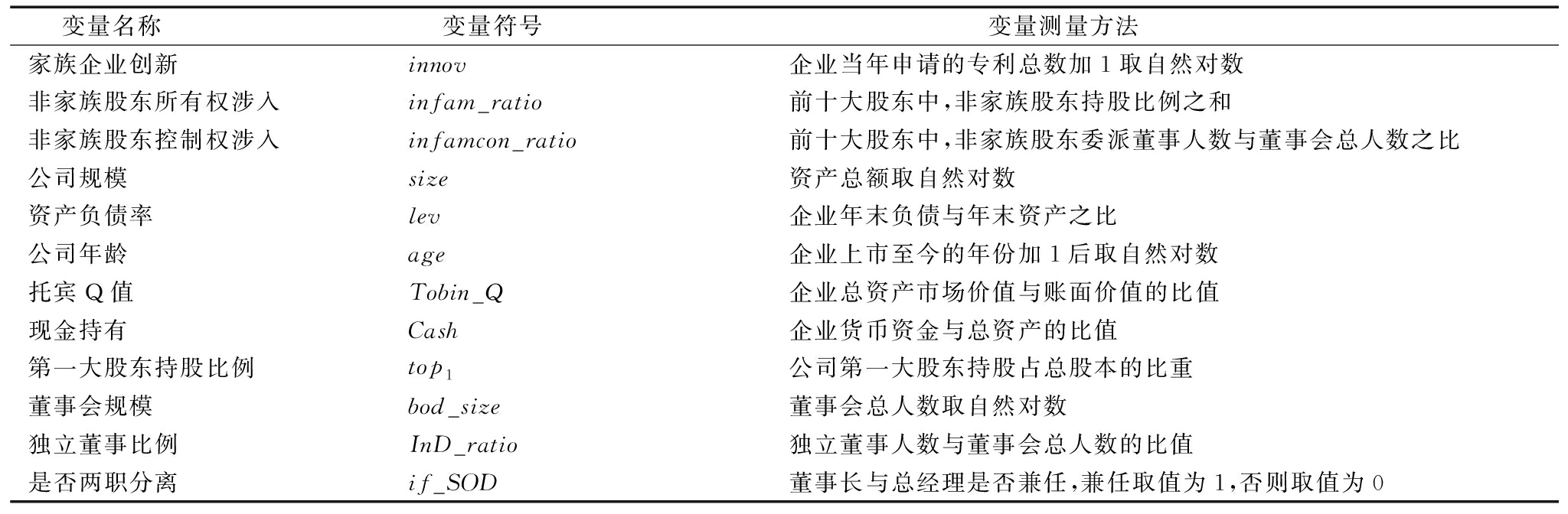 变量名称变量符号变量测量方法 家族企业创新innov企业当年申请的专利总数加1取自然对数非家族股东所有权涉入infam_ratio前十大股东中,非家族股东持股比例之和非家族股东控制权涉入infamcon_ratio前十大股东中,非家族股东委派董事人数与董事会总人数之比公司规模size资产总额取自然对数资产负债率lev企业年末负债与年末资产之比公司年龄age企业上市至今的年份加1后取自然对数托宾Q值Tobin_Q企业总资产市场价值与账面价值的比值现金持有Cash企业货币资金与总资产的比值第一大股东持股比例top1公司第一大股东持股占总股本的比重董事会规模bod_size董事会总人数取自然对数独立董事比例InD_ratio独立董事人数与董事会总人数的比值是否两职分离if_SOD董事长与总经理是否兼任,兼任取值为1,否则取值为0