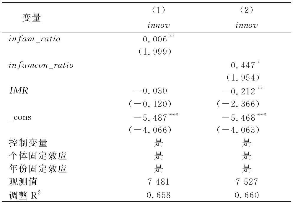变量(1)(2)innovinnovinfam_ratio0.006**(1.999)infamcon_ratio0.447*(1.954)IMR-0.030-0.212**(-0.120)(-2.366)_cons-5.487***-5.468***(-4.066)(-4.063)控制变量是是个体固定效应是是年份固定效应是是观测值7 4817 527调整R20.6580.660