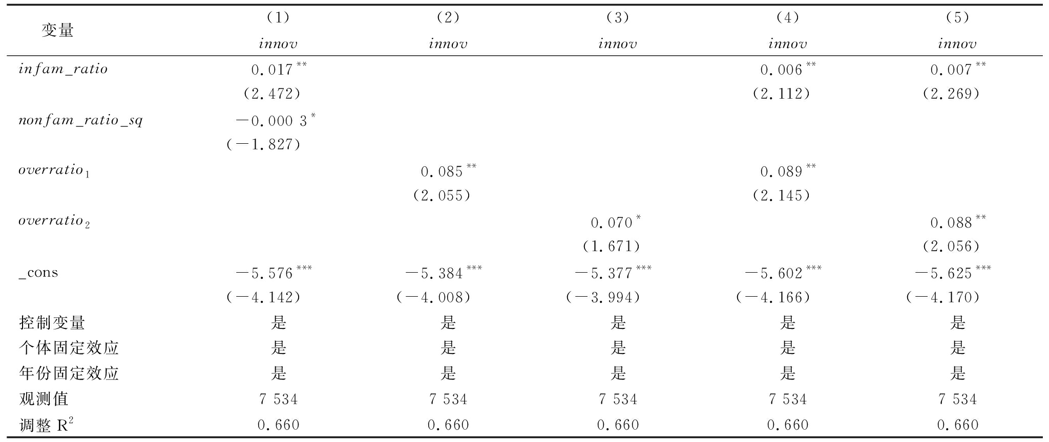 变量(1)(2)(3)(4)(5)innovinnovinnovinnovinnovinfam_ratio0.017**0.006**0.007**(2.472)(2.112)(2.269)nonfam_ratio_sq-0.000 3*(-1.827)overratio10.085**0.089**(2.055)(2.145)overratio20.070*0.088**(1.671)(2.056)_cons-5.576***-5.384***-5.377***-5.602***-5.625***(-4.142)(-4.008)(-3.994)(-4.166)(-4.170)控制变量是是是是是个体固定效应是是是是是年份固定效应是是是是是观测值7 5347 5347 5347 5347 534调整R20.6600.6600.6600.6600.660