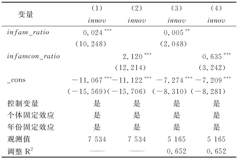 其中,i、t分别代表企业、年份;innov代表家族企业创新水平;infam_ratio代表非家族股东所有权涉入;infamcon_ratio代表非家族股东控制权涉入;α1、β1为本文关注的核心系数,分别反映非家族股东所有权涉入(infam_ratio)和控制权涉入(infamcon_ratio)对家族企业创新的影响。Controlit表示控制变量集合,μi、τi表示企业固定效应,δt、ωt表示年份固定效应,εit、eit为误差项。此外,本文计算了企业层面聚类稳健标准误。