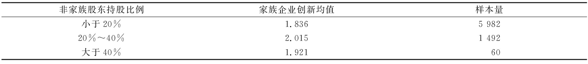 非家族股东持股比例家族企业创新均值样本量小于20%1.8365 98220%~40%2.0151 492大于40%1.92160