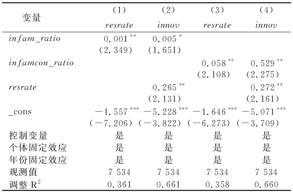 变量(1)(2)(3)(4)innovinnovinnovinnovinfam_ratio0.005***0.006**(2.674)(2.053)infamcon_ratio0.476*0.544**(1.950)(2.332)_cons1.8121.835-5.550***-5.490***(73.858)(95.840)(-4.120)(-4.083)控制变量否否是是个体固定效应是是是是年份固定效应是是是是观测值7 5347 5347 5347 534调整R20.6530.6530.6600.660