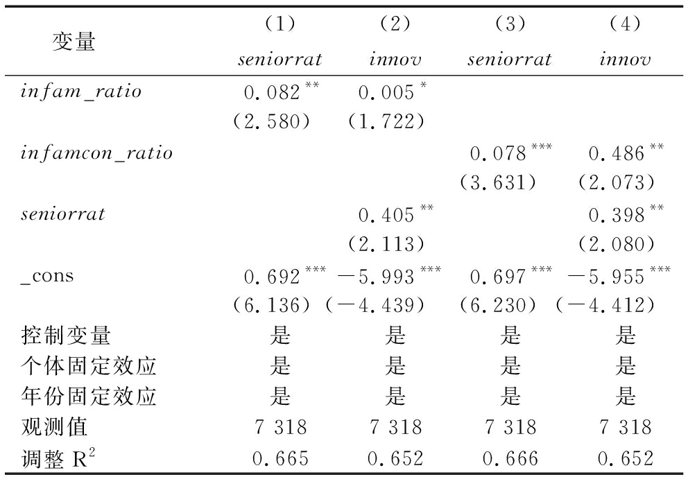变量(1)(2)(3)(4)seniorratinnovseniorratinnovinfam_ratio0.082**0.005*(2.580)(1.722)infamcon_ratio0.078***0.486**(3.631)(2.073)seniorrat0.405**0.398**(2.113)(2.080)_cons0.692***-5.993***0.697***-5.955***(6.136)(-4.439)(6.230)(-4.412)控制变量是是是是个体固定效应是是是是年份固定效应是是是是观测值7 3187 3187 3187 318调整R20.6650.6520.6660.652