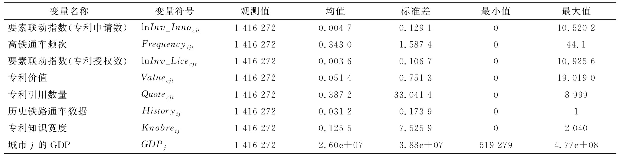 变量名称变量符号观测值均值标准差最小值最大值要素联动指数(专利申请数)lnInv_Innocjt1 416 2720.004 70.129 1010.520 2高铁通车频次Frequencyijt1 416 2720.343 01.587 4044.1要素联动指数(专利授权数)lnInv_Licecjt1 416 2720.003 60.106 7010.925 6专利价值Valuecjt1 416 2720.051 40.751 3019.019 0专利引用数量Quotecjt1 416 2720.387 233.041 408 999历史铁路通车数据Historyij1 416 2720.031 20.173 901专利知识宽度Knobreij1 416 2720.125 57.525 902 040城市j的GDPGDPj1 416 2722.60e+073.88e+07519 2794.77e+08