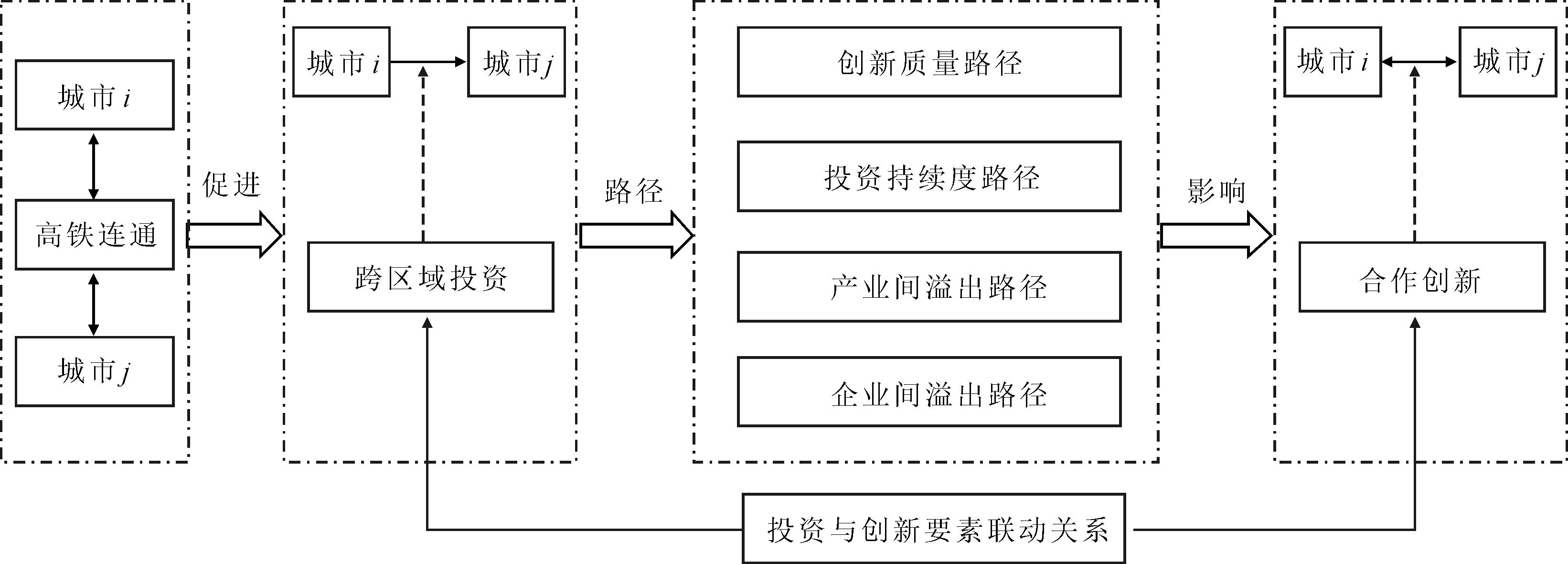H2:高铁连通通过创新质量路径、投资持续度路径和投资溢出路径强化投资对创新的带动作用,提升投资—创新要素联动效应。
