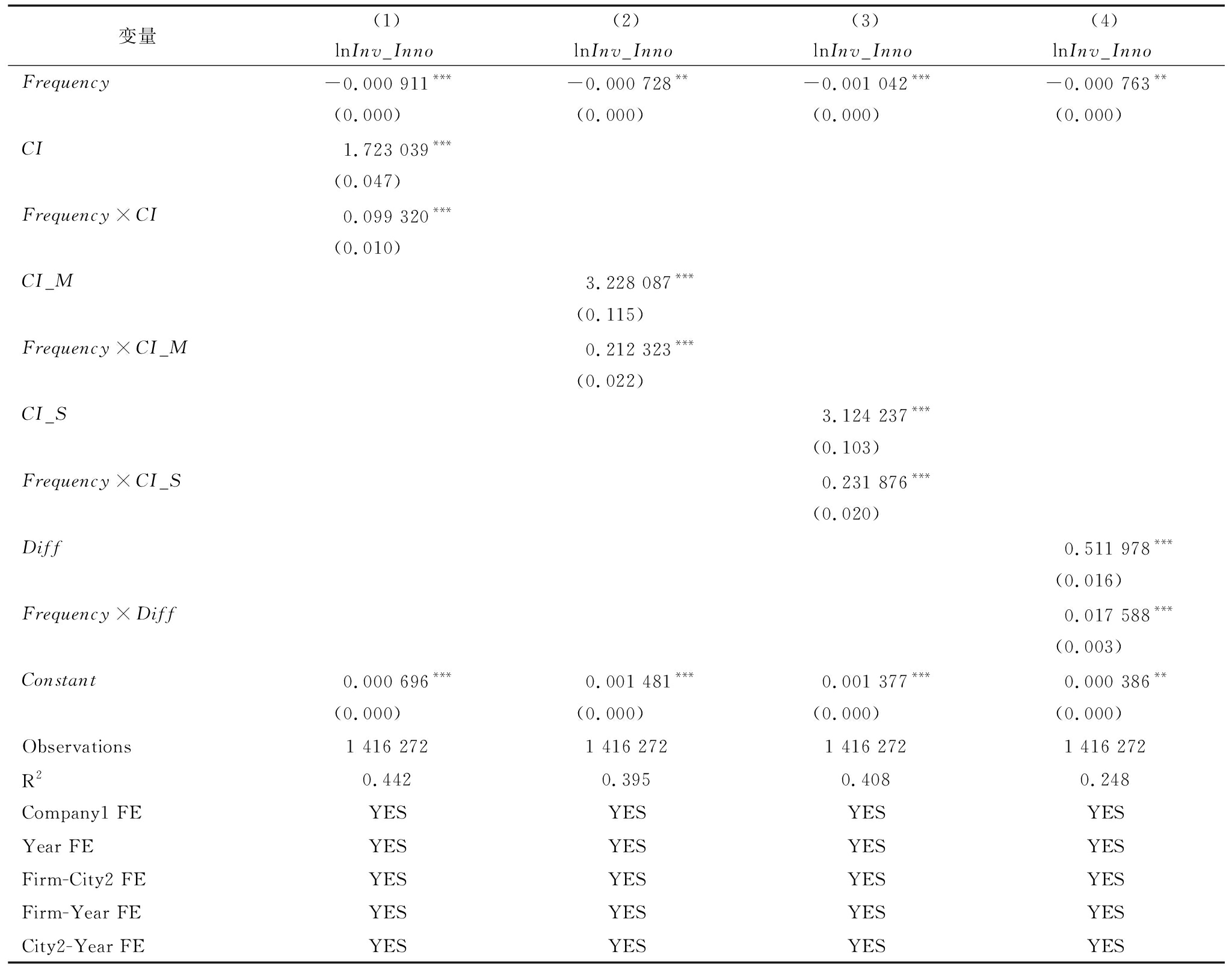 变量(1)(2)(3)(4)lnInv_InnolnInv_InnolnInv_InnolnInv_InnoFrequency-0.000 911***-0.000 728**-0.001 042***-0.000 763**(0.000)(0.000)(0.000)(0.000)CI1.723 039***(0.047)Frequency×CI0.099 320***(0.010)CI_M3.228 087***(0.115)Frequency×CI_M0.212 323***(0.022)CI_S3.124 237***(0.103)Frequency×CI_S0.231 876***(0.020)Diff0.511 978***(0.016)Frequency×Diff0.017 588***(0.003)Constant0.000 696***0.001 481***0.001 377***0.000 386**(0.000)(0.000)(0.000)(0.000)Observations1 416 2721 416 2721 416 2721 416 272R20.4420.3950.4080.248Company1 FEYESYESYESYESYear FEYESYESYESYESFirm-City2 FEYESYESYESYESFirm-Year FEYESYESYESYESCity2-Year FEYESYESYESYES