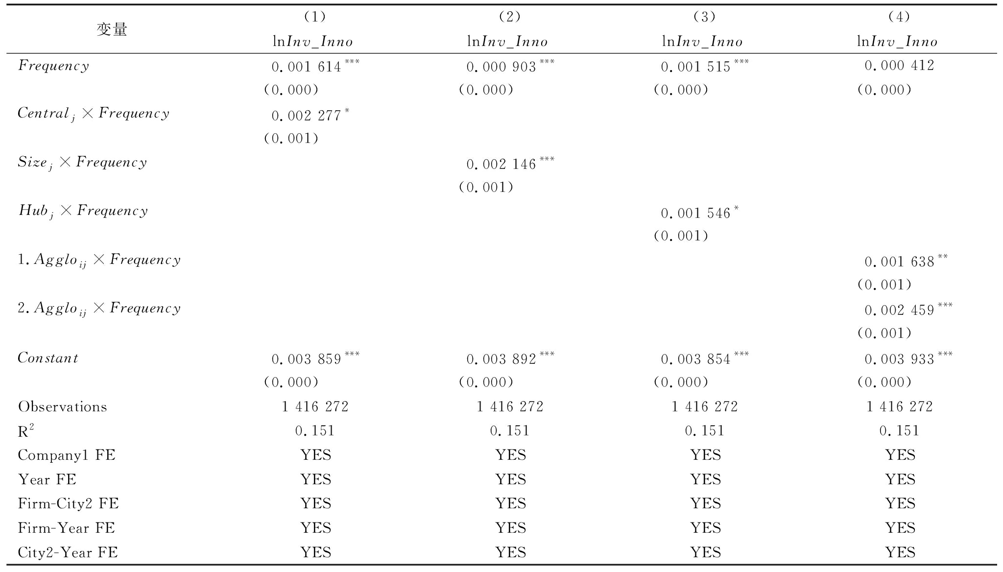 变量(1)(2)(3)(4)lnInv_InnolnInv_InnolnInv_InnolnInv_InnoFrequency0.001 614***0.000 903***0.001 515***0.000 412(0.000)(0.000)(0.000)(0.000)Centralj×Frequency0.002 277*(0.001)Sizej×Frequency0.002 146***(0.001)Hubj×Frequency0.001 546*(0.001)1.Aggloij×Frequency0.001 638**(0.001)2.Aggloij×Frequency0.002 459***(0.001)Constant0.003 859***0.003 892***0.003 854***0.003 933***(0.000)(0.000)(0.000)(0.000)Observations1 416 2721 416 2721 416 2721 416 272R20.1510.1510.1510.151Company1 FEYESYESYESYESYear FEYESYESYESYESFirm-City2 FEYESYESYESYESFirm-Year FEYESYESYESYESCity2-Year FEYESYESYESYES
