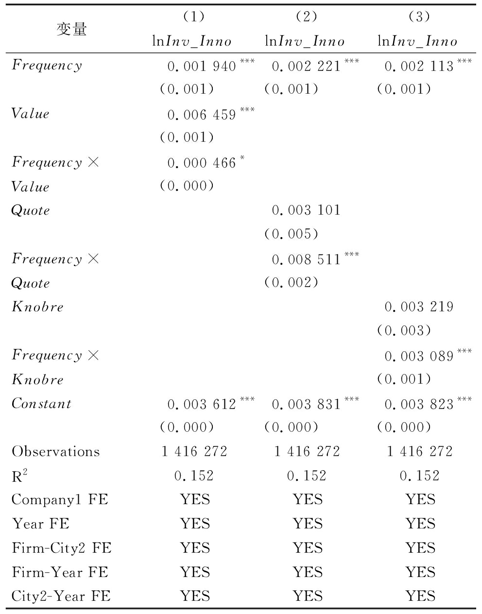变量(1)(2)(3)lnInv_InnolnInv_InnolnInv_InnoFrequency 0.001 940*** 0.002 221*** 0.002 113***(0.001)(0.001)(0.001)Value0.006 459***(0.001)Frequency×Value0.000 466*(0.000)Quote0.003 101(0.005)Frequency×Quote0.008 511***(0.002)Knobre0.003 219(0.003)Frequency×Knobre0.003 089***(0.001)Constant0.003 612***0.003 831***0.003 823***(0.000)(0.000)(0.000)Observations1 416 2721 416 2721 416 272R20.1520.1520.152Company1 FEYESYESYESYear FEYESYESYESFirm-City2 FEYESYESYESFirm-Year FEYESYESYESCity2-Year FEYESYESYES