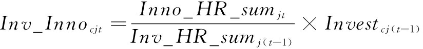 其中,Inv_Innocjt为投资—创新要素联动指数,表示在高铁连通环境下第t-1年上市公司c的投资对第t年城市j的创新产出理论上的拉动值。Inno_HR_sumjt表示在高铁连通环境下城市j在第t年的合作专利总数,用第t年上市公司c与城市j所有联合申请专利数量之和衡量,其中上市公司c所在城市i与城市j之间存在高铁连通。Inv_HR_sumj(t-1)表示在高铁连通环境下城市j在第t-1年所接受的投资额总数,用第t-1年上市公司c对城市j的所有投资额之和衡量,其中上市公司c所在城市i与城市j之间存在高铁连通;当Inv_HR_sumj(t-1)取值为0时,Inv_Innocjt直接取值为0,不再进行分数计算。Investcj(t-1)表示滞后一年(即t-1年)上市公司c对城市j的投资额。