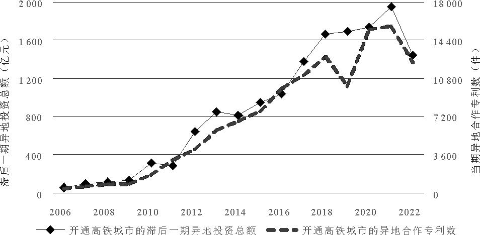 为揭示高铁连通后城市异地投资与合作创新的潜在联系,本文将样本期内连通高铁的城市两两匹配形成城市对层面数据,城市对异地投资额与异地合作专利申请数量按照年份分别加总,并基于合作专利总数与滞后一期投资总额绘制图2。整体而言,滞后一期投资数据与创新数据呈现较强的长期相关性。本文认为在高铁连通的影响下,投资与合作创新存在较强相关关系,且投资对合作创新的影响存在一定滞后效应。