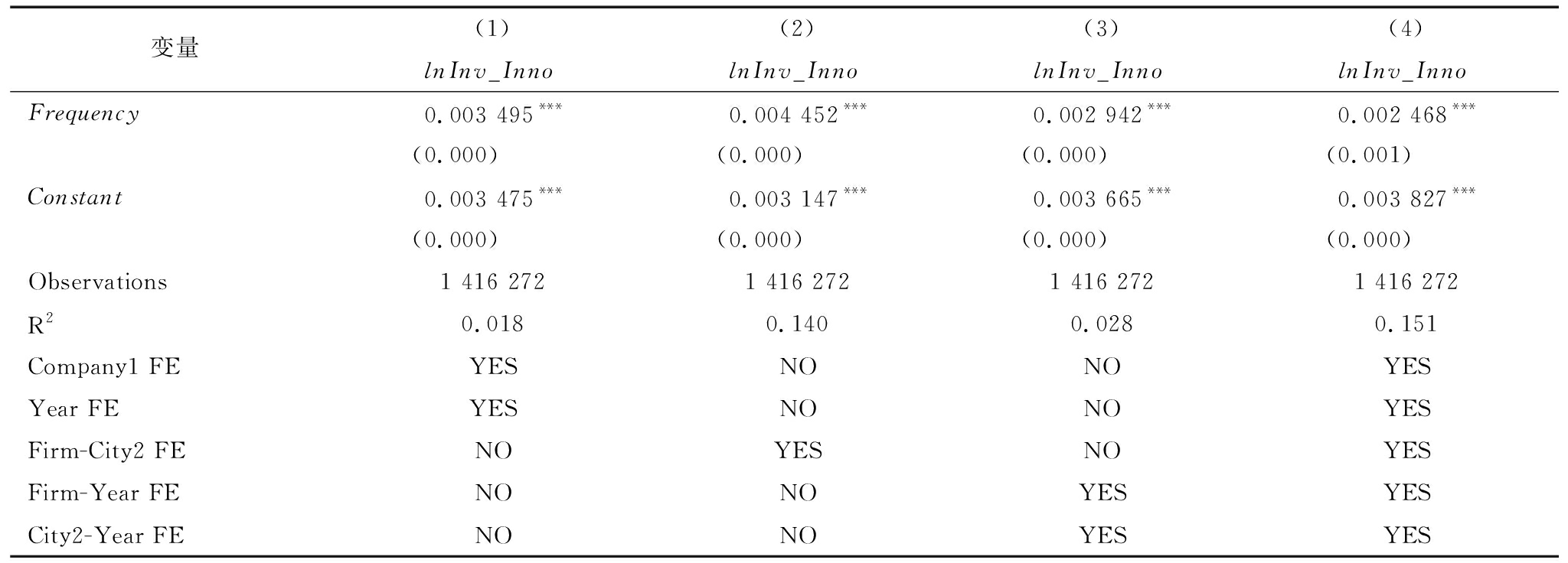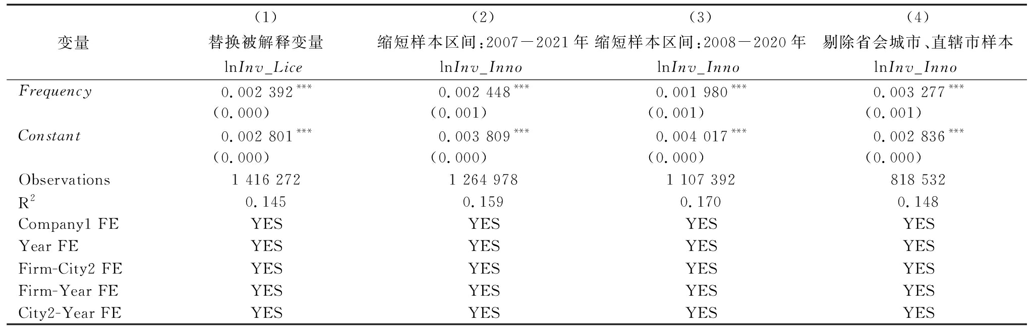 变量(1)(2)(3)(4)lnInv_InnolnInv_InnolnInv_InnolnInv_InnoFrequency0.003 495***0.004 452***0.002 942***0.002 468***(0.000)(0.000)(0.000)(0.001)Constant0.003 475***0.003 147***0.003 665***0.003 827***(0.000)(0.000)(0.000)(0.000)Observations1 416 2721 416 2721 416 2721 416 272R20.0180.1400.0280.151Company1 FEYESNONOYESYear FEYESNONOYESFirm-City2 FENOYESNOYESFirm-Year FENONOYESYESCity2-Year FENONOYESYES