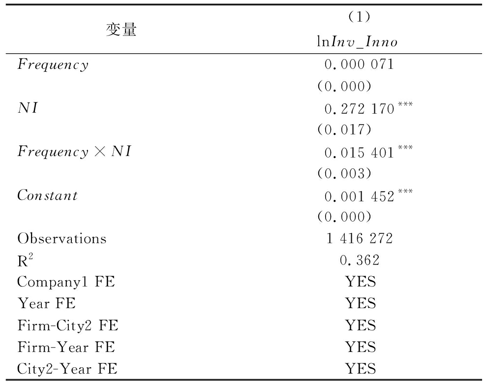 变量(1)lnInv_InnoFrequency0.000 071(0.000)NI0.272 170***(0.017)Frequency×NI0.015 401***(0.003)Constant0.001 452***(0.000)Observations1 416 272R20.362Company1 FEYESYear FEYESFirm-City2 FEYESFirm-Year FEYESCity2-Year FEYES